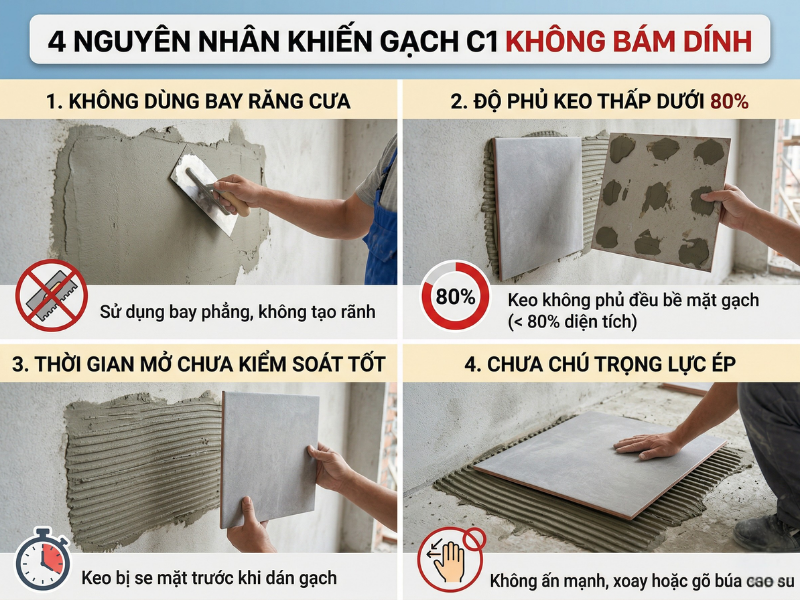 - Không kiểm tra và điều chỉnh thời gian mở (open time) của keo, dẫn đến keo se mặt trước khi gạch được đặt, hạn chế khả năng liên kết.