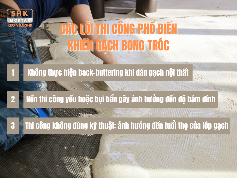 Ngoài các lỗi trên, việc thi công không đúng kỹ thuật cũng là nguyên nhân phổ biến gây bong tróc gạch. Một số sai sót kỹ thuật thường gặp bao gồm: